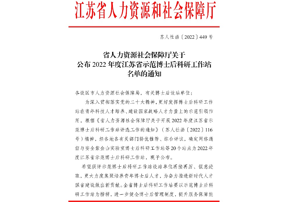 关于公布 2022 年度江苏省示范博士后科研工作站名单的通知